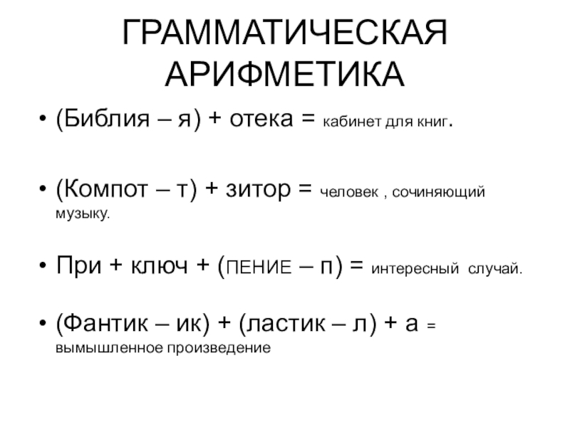 ГРАММАТИЧЕСКАЯ АРИФМЕТИКА(Библия – я) + отека = кабинет для книг.(Компот – т) + зитор = человек ,