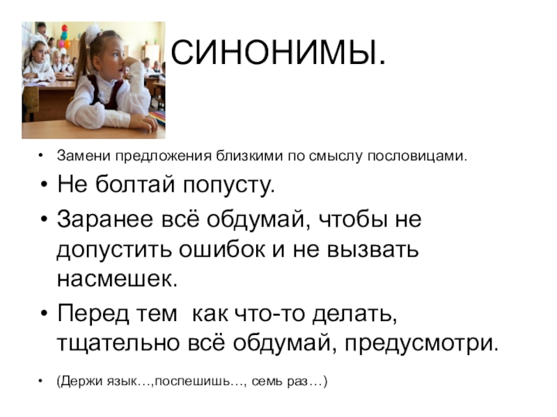СИНОНИМЫ.Замени предложения близкими по смыслу пословицами.Не болтай попусту.Заранее всё обдумай, чтобы не допустить ошибок и не вызвать