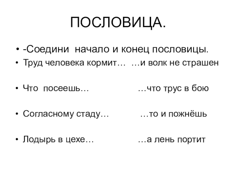 ПОСЛОВИЦА.-Соедини начало и конец пословицы.Труд человека кормит… …и волк не страшенЧто посеешь…