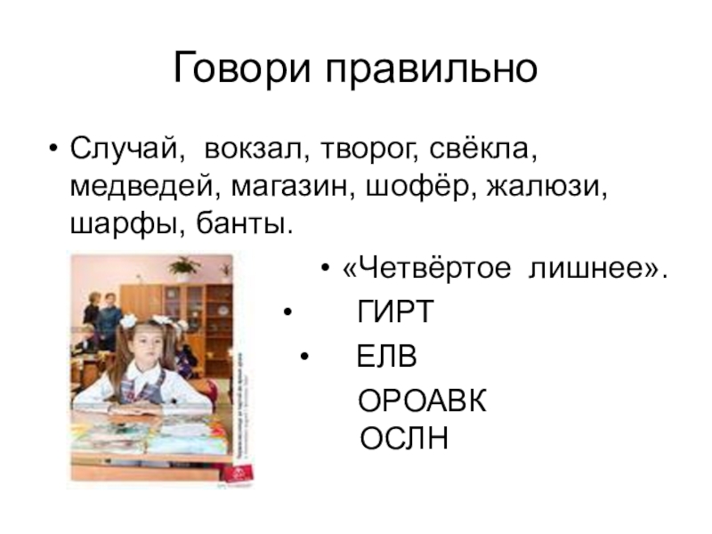 Говори правильноСлучай, вокзал, творог, свёкла, медведей, магазин, шофёр, жалюзи, шарфы, банты.«Четвёртое лишнее».   ГИРТ  ЕЛВ