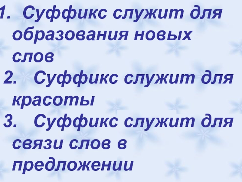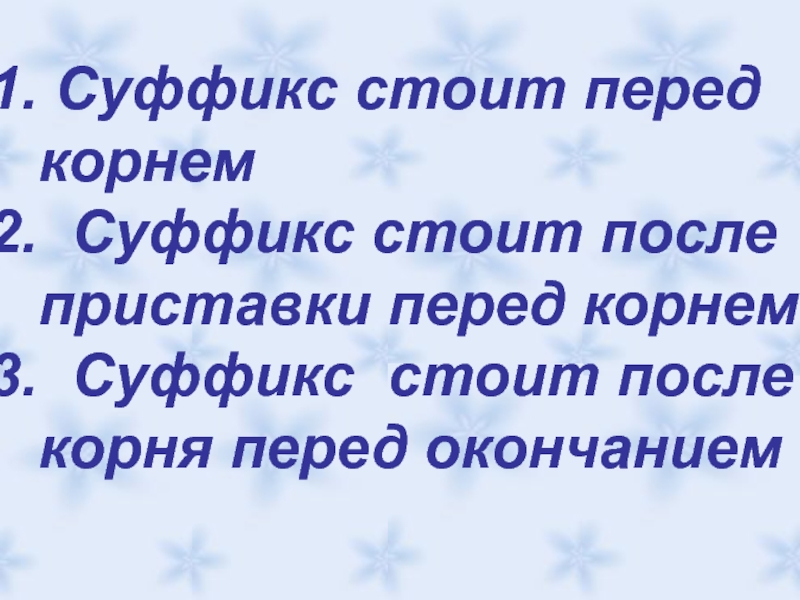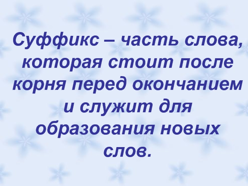 Суффикс – часть слова, которая стоит после корня перед окончанием и служит для образования новых слов.