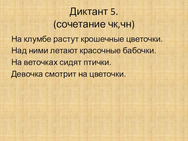 Диктант 5. (сочетание чк,чн)На клумбе растут крошечные цветочки.Над ними летают красочные бабочки.На веточках сидят птички.Девочка смотрит на