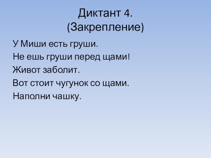 Диктант 4. (Закрепление)У Миши есть груши.Не ешь груши перед щами!Живот заболит.Вот стоит чугунок со щами.Наполни чашку.