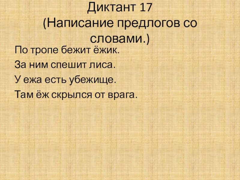 Диктант 17 (Написание предлогов со словами.)По тропе бежит ёжик.За ним спешит лиса.У ежа есть убежище.Там ёж скрылся