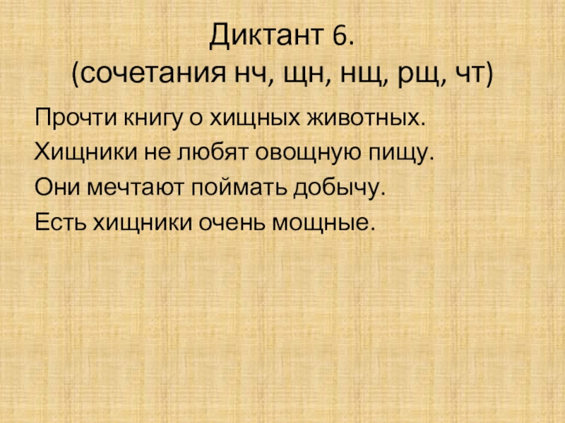 Диктант 6. (сочетания нч, щн, нщ, рщ, чт)Прочти книгу о хищных животных.Хищники не любят овощную пищу.Они мечтают
