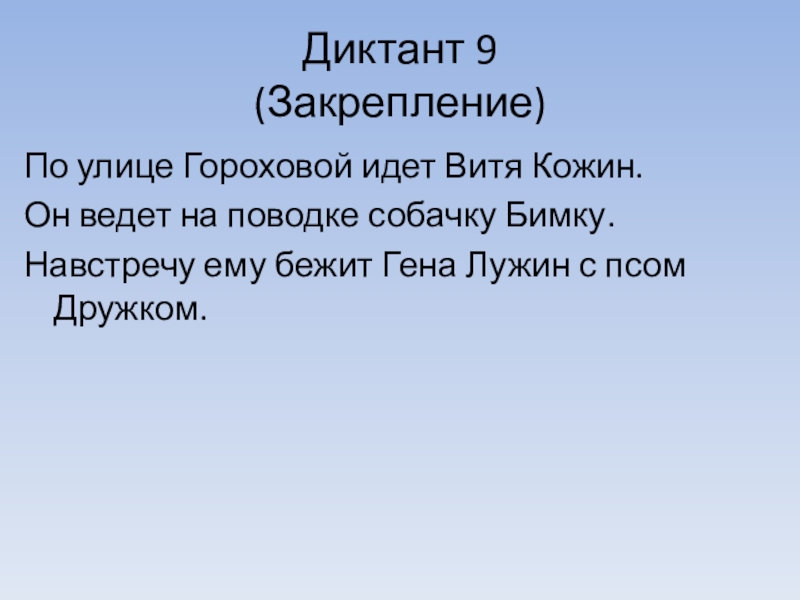 Диктант 9 (Закрепление)По улице Гороховой идет Витя Кожин.Он ведет на поводке собачку Бимку.Навстречу ему бежит Гена Лужин