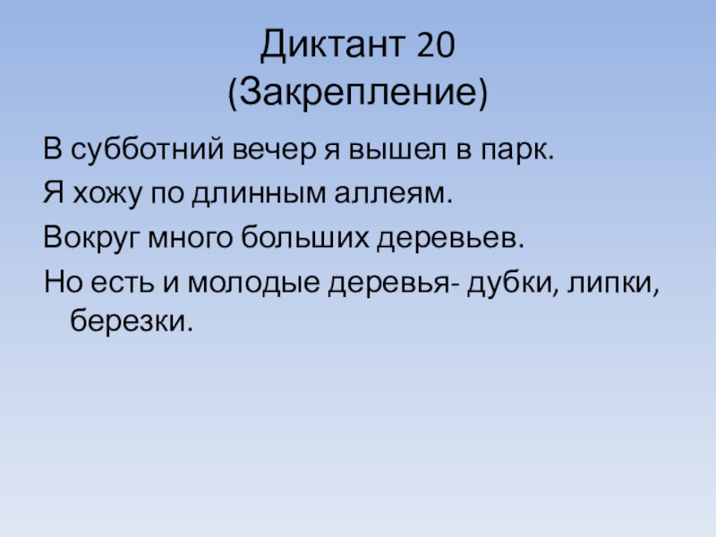 Диктант 20 (Закрепление)В субботний вечер я вышел в парк.Я хожу по длинным аллеям.Вокруг много больших деревьев.Но есть