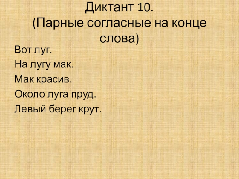 Диктант 10. (Парные согласные на конце слова)Вот луг.На лугу мак.Мак красив.Около луга пруд.Левый берег крут.