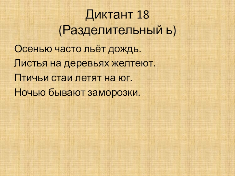 Диктант 18 (Разделительный ь)Осенью часто льёт дождь.Листья на деревьях желтеют.Птичьи стаи летят на юг.Ночью бывают заморозки.