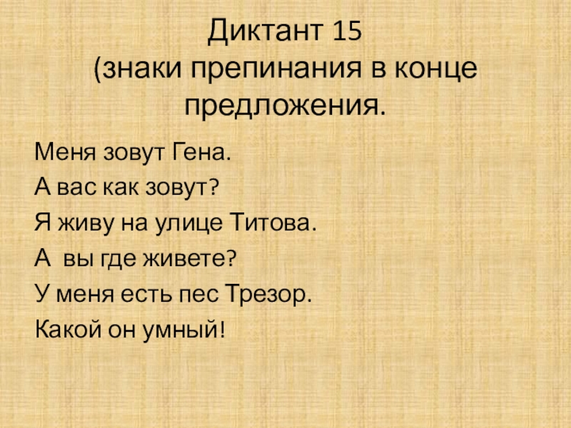 Диктант 15 (знаки препинания в конце предложения.Меня зовут Гена.А вас как зовут?Я живу на улице Титова.А вы