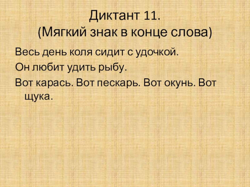 Диктант 11. (Мягкий знак в конце слова)Весь день коля сидит с удочкой.Он любит удить рыбу.Вот карась. Вот