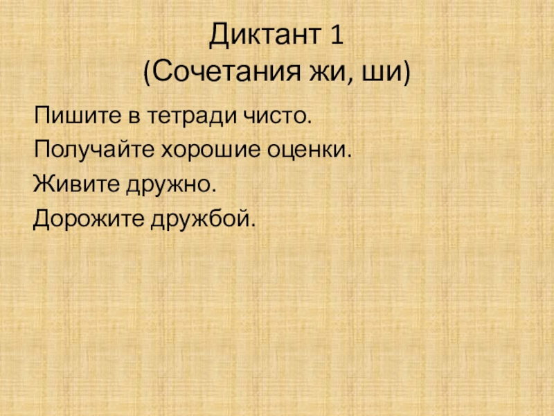 Диктант 1  (Сочетания жи, ши)Пишите в тетради чисто.Получайте хорошие оценки.Живите дружно.Дорожите дружбой.
