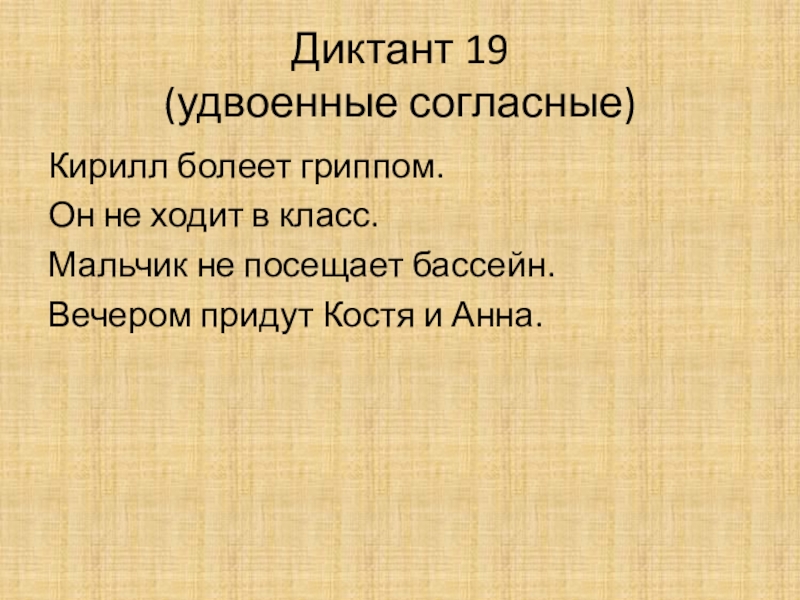 Диктант 19 (удвоенные согласные)Кирилл болеет гриппом.Он не ходит в класс.Мальчик не посещает бассейн.Вечером придут Костя и Анна.