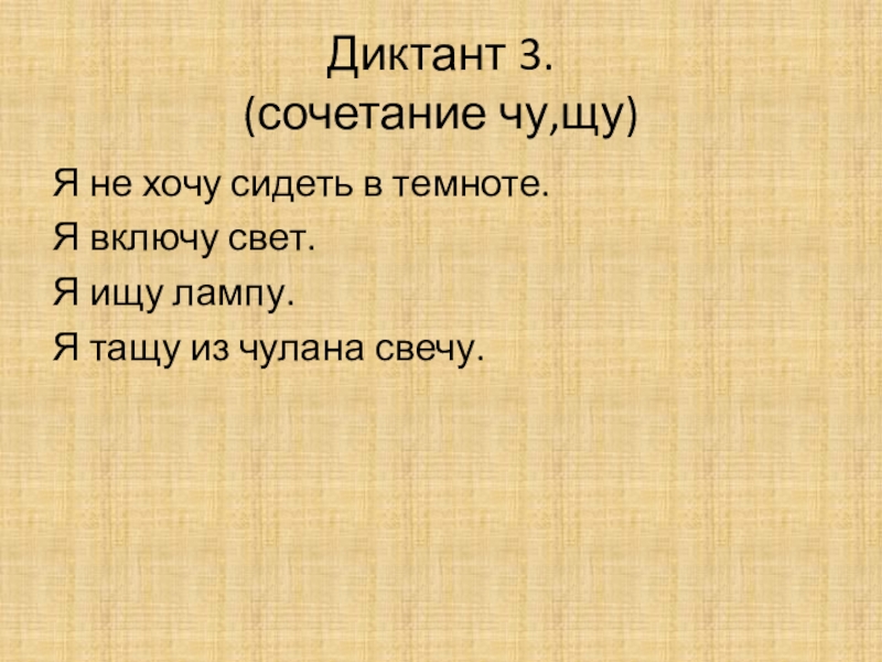 Диктант 3. (сочетание чу,щу) Я не хочу сидеть в темноте.Я включу свет.Я ищу лампу.Я тащу из