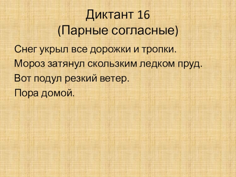 Диктант 16 (Парные согласные)Снег укрыл все дорожки и тропки.Мороз затянул скользким ледком пруд.Вот подул резкий ветер.Пора домой.