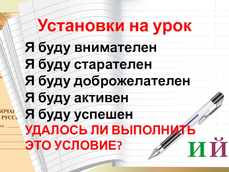 Установки на урокЯ буду внимателенЯ буду старателенЯ буду доброжелателенЯ буду активенЯ буду успешен УДАЛОСЬ ЛИ ВЫПОЛНИТЬ ЭТО