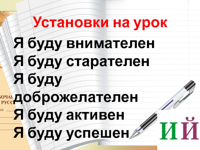 Установки на урокЯ буду внимателенЯ буду старателенЯ буду доброжелателенЯ буду активенЯ буду успешен
