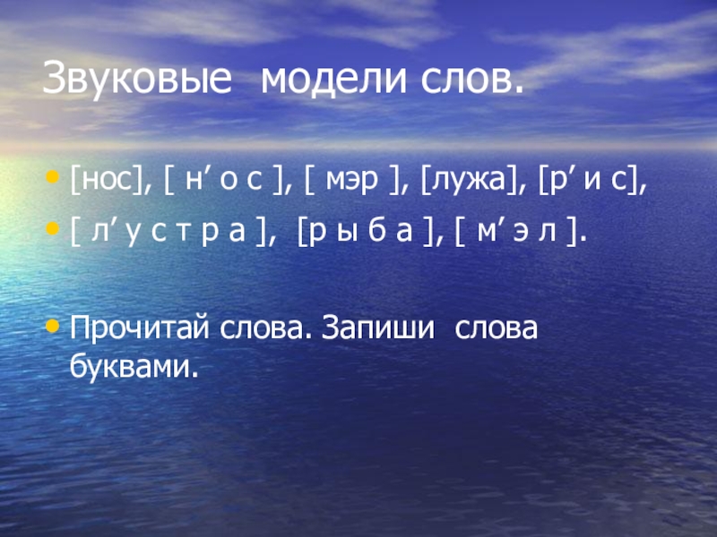 Звуковые модели слов.[нос], [ н’ о с ], [ мэр ], [лужа], [р’ и с],[ л’ у