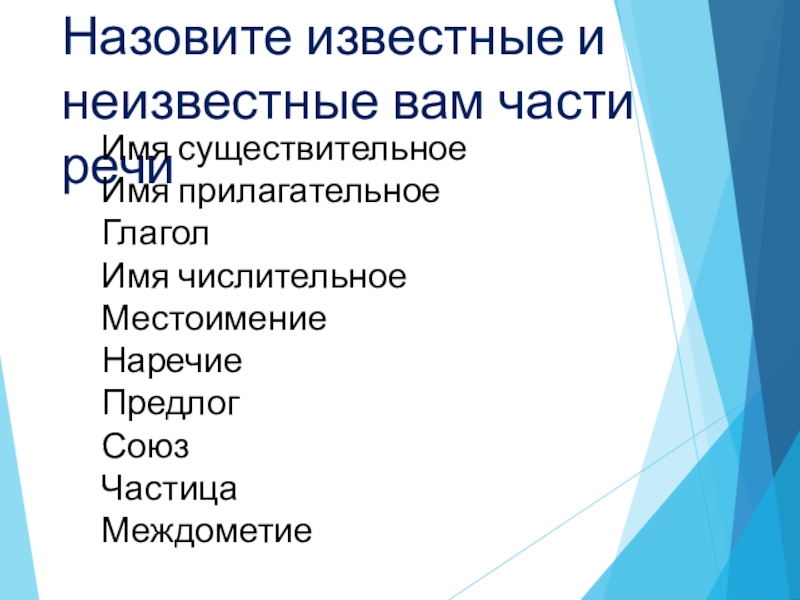 Слайд 11Назовите известные и неизвестные вам части речи
