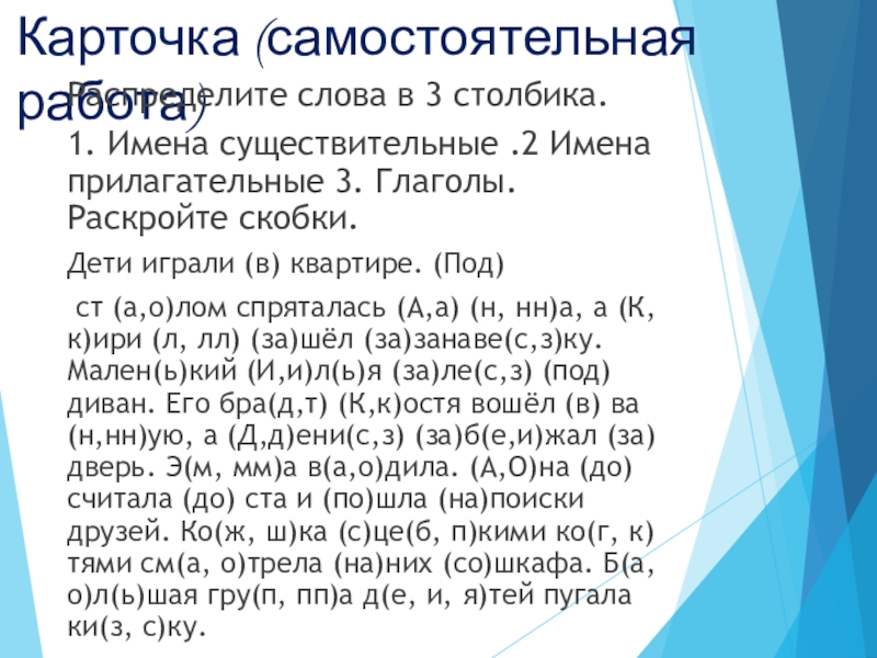 ст (а,о)лом спряталась (А,а) (н, нн)а, а (К,к)ири (л, лл) (за)шёл (за)занаве(с,з)ку. Мален(ь)кий (И,и)л(ь)я (за)ле(с,з) (под) диван. Его бра(д,т) (К,к)остя вошёл (в) ва(н,нн)ую, а (Д,д)ени(с,з) (за)б(е,и)жал (за)дверь. Э(м, мм)а в(а,о)дила. (А,О)на (до)считала (до) ста и (по)шла (на)поиски друзей. Ко(ж, ш)ка (с)це(б, п)кими ко(г, к)тями см(а, о)трела (на)них (со)шкафа. Б(а, о)л(ь)шая гру(п, пп)а д(е, и, я)тей пугала ки(з, с)ку.