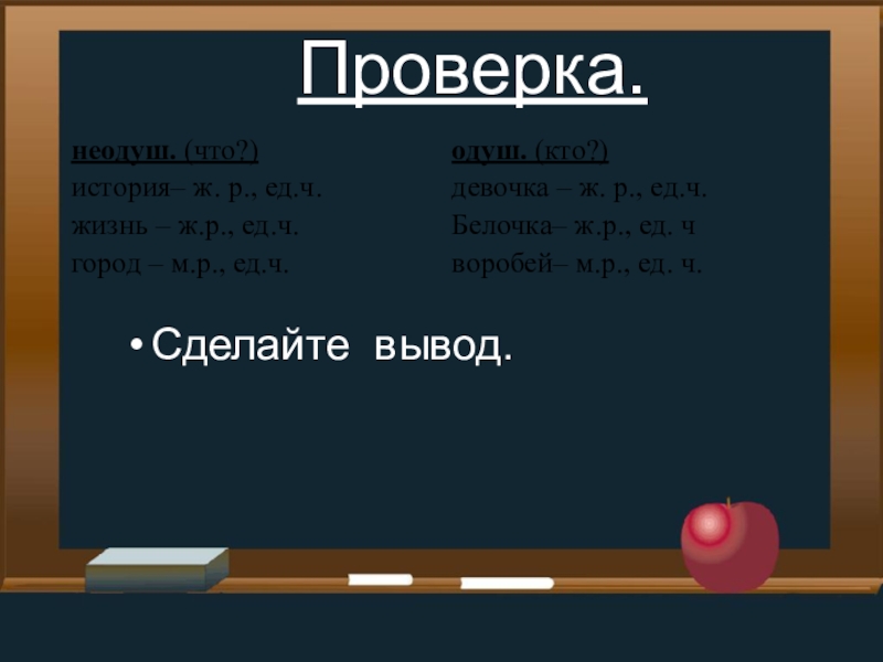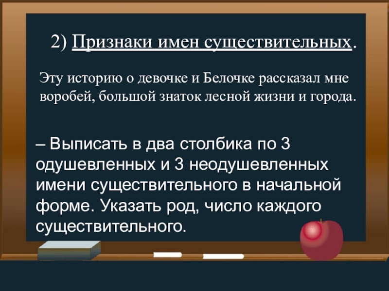 – Выписать в два столбика по 3 одушевленных и 3 неодушевленных имени существительного в начальной форме. Указать род, число каждого существительного.