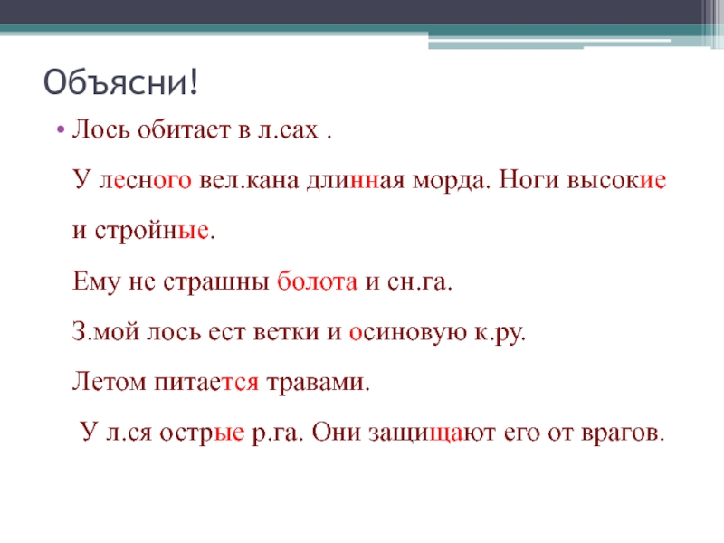 и стройные. Ему не страшны болота и сн.га. З.мой лось ест ветки и осиновую к.ру. Летом питается травами. У л.ся острые р.га. Они защищают его от врагов.