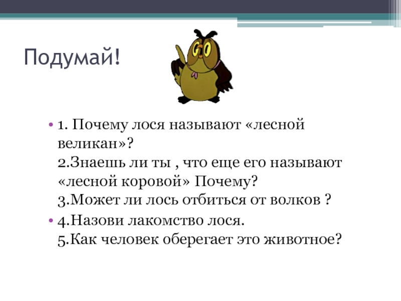 Подумай!1. Почему лося называют «лесной великан»? 2.Знаешь ли ты , что еще его называют «лесной коровой» Почему?