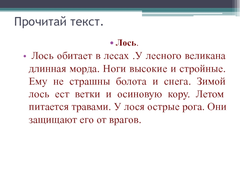 Прочитай текст.Лось. Лось обитает в лесах .У лесного великана длинная морда. Ноги высокие и стройные. Ему не