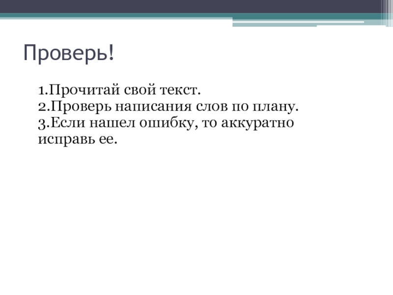 Проверь!  1.Прочитай свой текст. 2.Проверь написания слов по плану. 3.Если нашел ошибку, то аккуратно исправь ее.