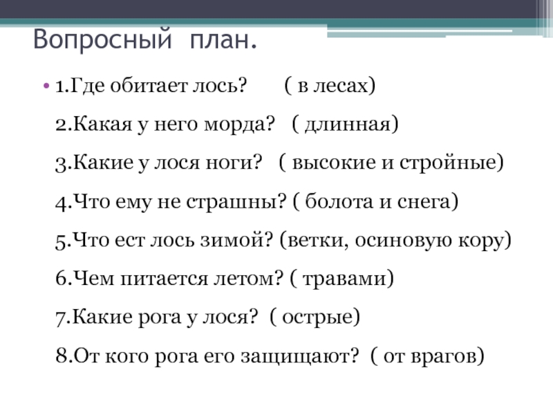 Вопросный план.1.Где обитает лось?    ( в лесах) 2.Какая у него морда?  ( длинная)