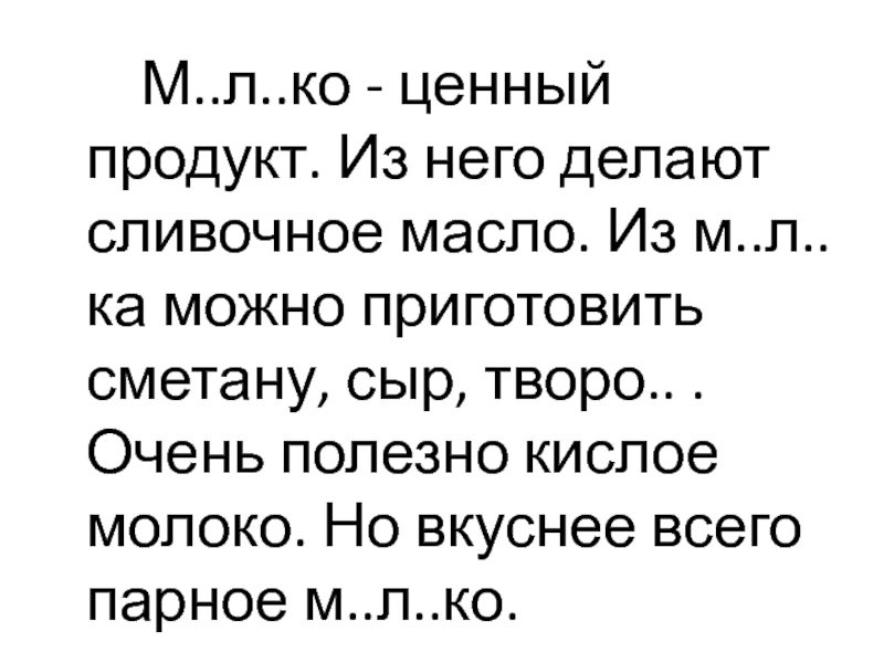 Слайд 2 М..л..ко - ценный продукт. Из него делают сливочное масло. Из м..л..ка