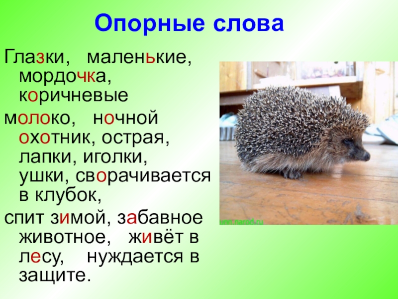 Опорные слова Глазки,  маленькие, мордочка, коричневыемолоко,  ночной охотник, острая, лапки, иголки,  ушки, сворачивается в