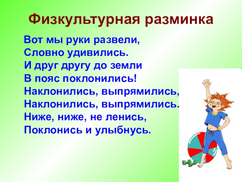 Физкультурная разминка  Вот мы руки развели,  Словно удивились.  И друг другу до земли