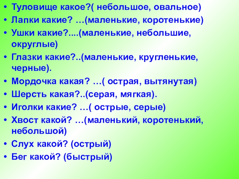 Туловище какое?( небольшое, овальное)Лапки какие? …(маленькие, коротенькие)Ушки какие?....(маленькие, небольшие, округлые) Глазки какие?..(маленькие, кругленькие, черные). Мордочка какая? …(