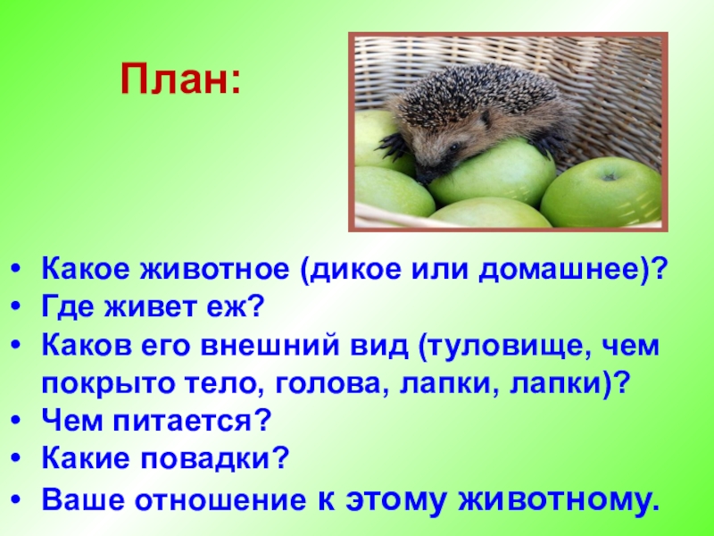 План:Какое животное (дикое или домашнее)?Где живет еж?Каков его внешний вид (туловище, чем покрыто тело, голова, лапки, лапки)?Чем