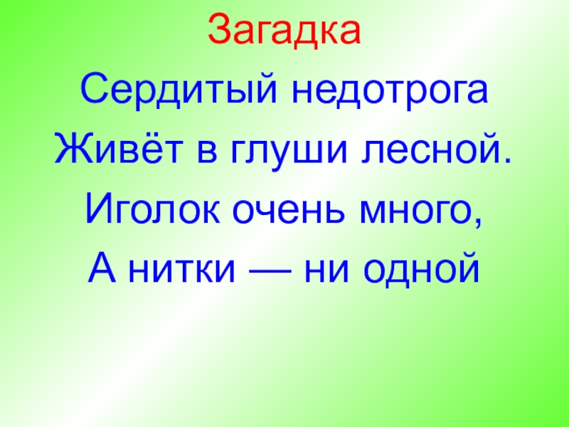 ЗагадкаСердитый недотрогаЖивёт в глуши лесной. Иголок очень много, А нитки — ни одной