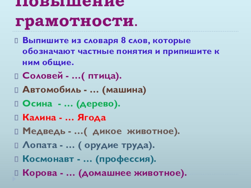 Повышение грамотности.Выпишите из словаря 8 слов, которые обозначают частные понятия и припишите к ним общие.Соловей - …(
