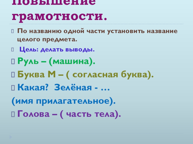 Повышение грамотности.По названию одной части установить название целого предмета. Цель: делать выводы.Руль – (машина).Буква М – (