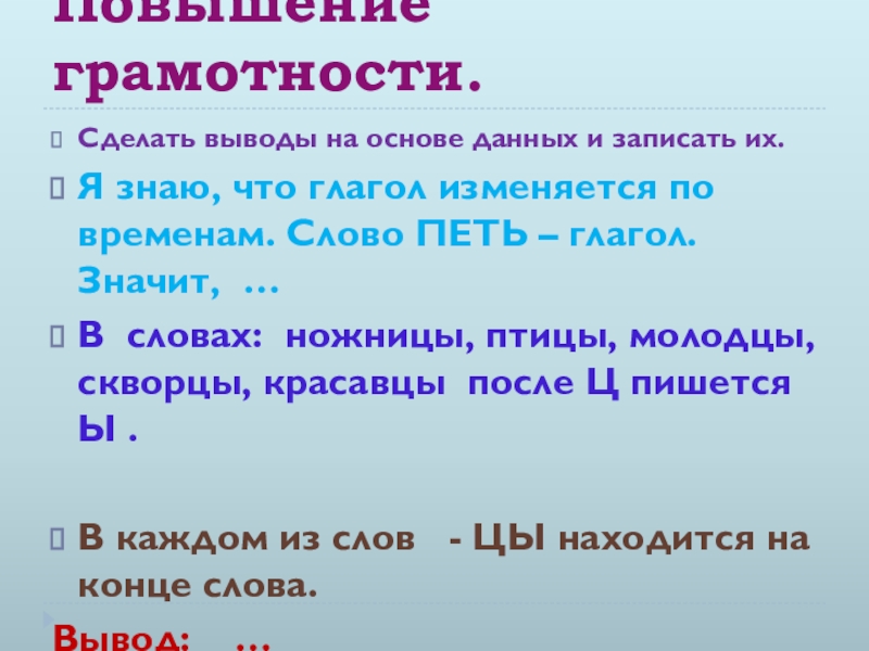Повышение грамотности.Сделать выводы на основе данных и записать их.Я знаю, что глагол изменяется по временам. Слово ПЕТЬ