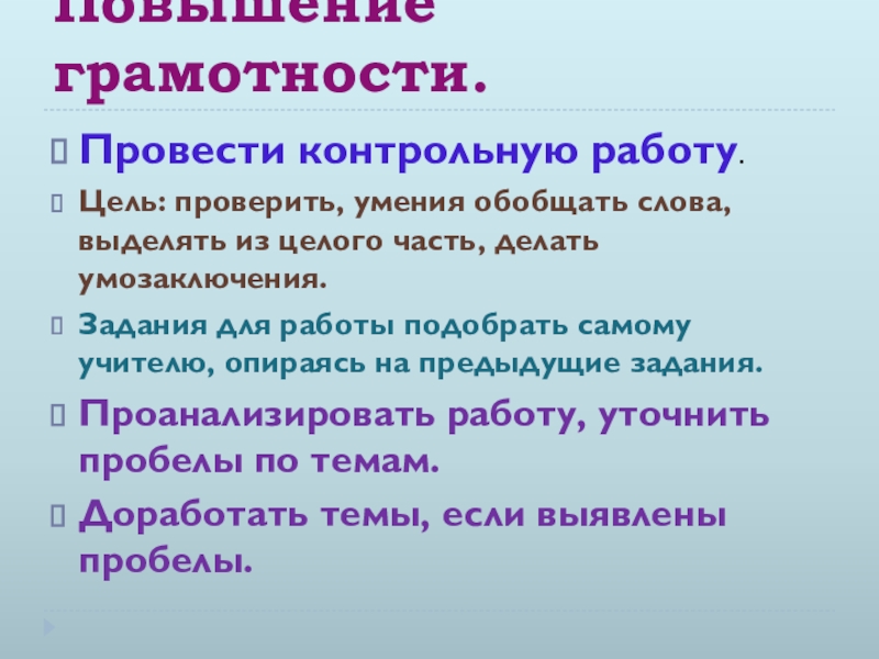 Повышение грамотности.Провести контрольную работу.Цель: проверить, умения обобщать слова, выделять из целого часть, делать умозаключения.Задания для работы подобрать