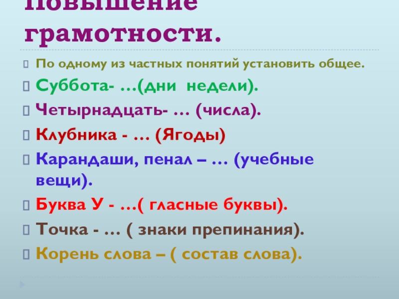 Повышение грамотности.По одному из частных понятий установить общее.Суббота- …(дни недели).Четырнадцать- … (числа).Клубника - … (Ягоды)Карандаши, пенал –