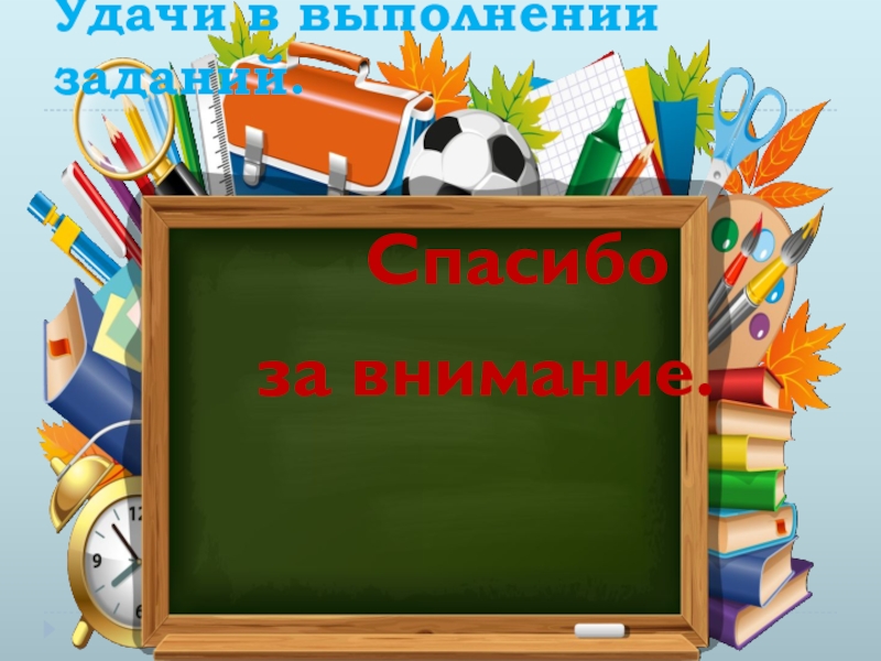 Удачи в выполнении заданий.    Спасибо      за внимание.