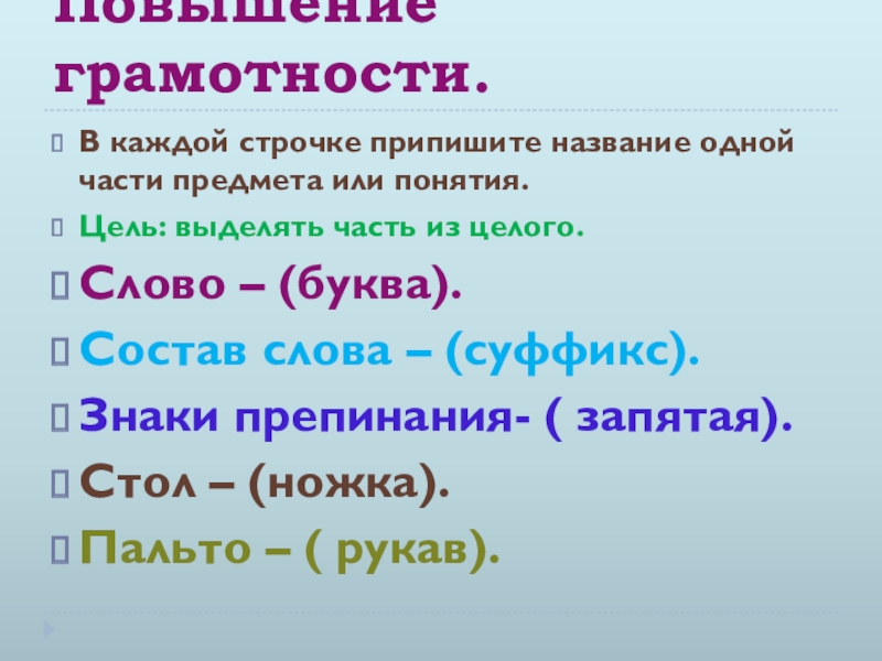 Повышение грамотности.В каждой строчке припишите название одной части предмета или понятия.Цель: выделять часть из целого.Слово – (буква).Состав