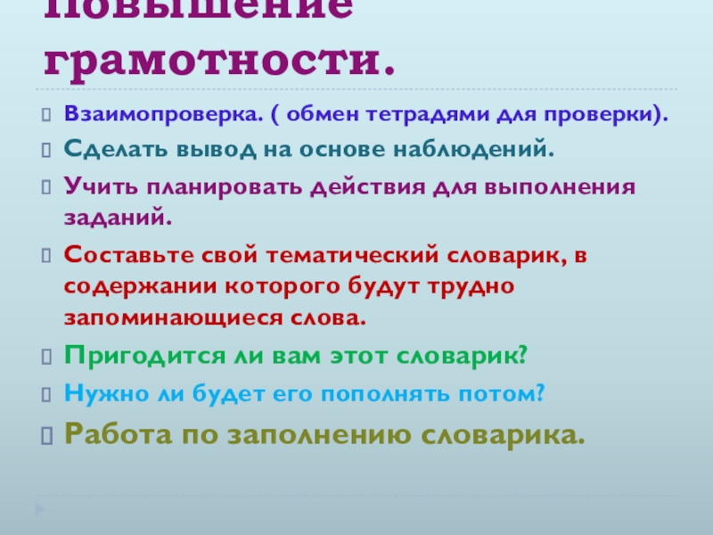Повышение грамотности.Взаимопроверка. ( обмен тетрадями для проверки).Сделать вывод на основе наблюдений.Учить планировать действия для выполнения заданий.Составьте свой