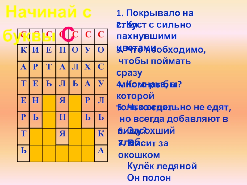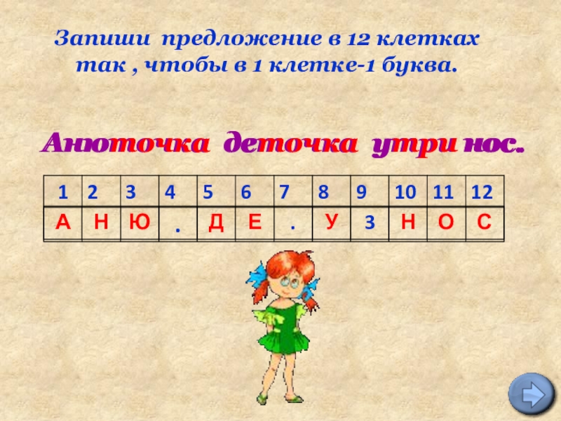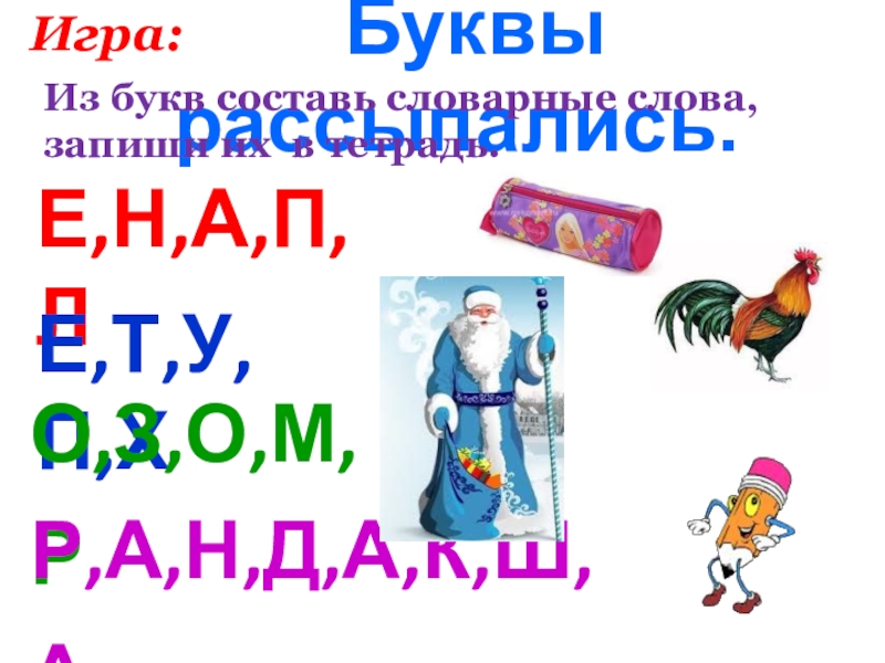 За 2 минуты записать как можно больше имён существительных в единственном числе из букв, входящих в слово: