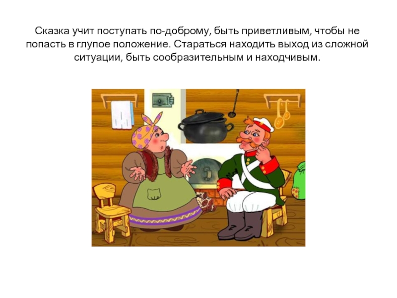 Слайд 19  Сказка учит поступать по-доброму, быть приветливым, чтобы не попасть в глупое
