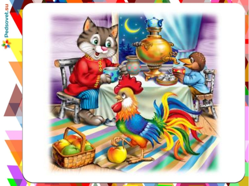 На полянке стоит избушка. Живут в избушке Кот и Петух