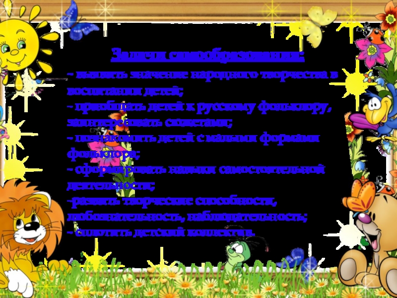 Задачи самообразования:- выявить значение народного творчества в воспитании детей;- приобщать детей к русскому фольклору, заинтересовать сюжетами;- познакомить