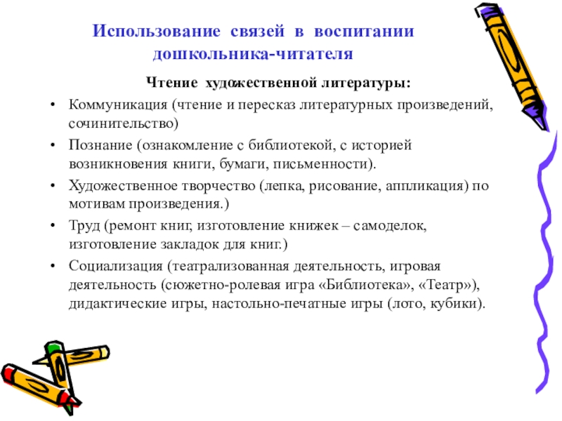 Слайд 7Использование связей в воспитании дошкольника-читателя