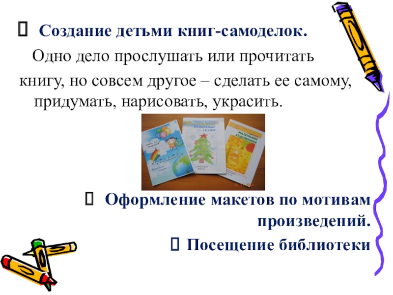 Слайд 15 Создание детьми книг-самоделок.